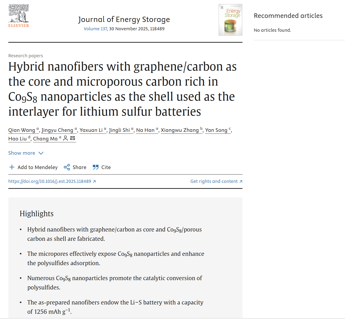 近日,我院无机非金属材料工程专业2022级本科生王茜依托天津市大学生创新创业训练计划(“大创”)项目重点项目《核(炭/石墨烯)@壳(硫化钴/多孔炭)纳米纤维的制备与多硫化物催化转化研究》(项目编号:202210058043),以第一作者身份在能源领域国际知名期刊《Journal of Energy Storage》(IF=9.8,JCR Q1区期刊)上发表了研究论文:Hybrid nanofibers with graphene/carbon as the core and microporous carbon rich in Co9S8 nanoparticles as the shell used as the interlayer for lithium sulfur batteries (Journal of Energy Storage, 2025: 137(30), 118489)。该工作基于同轴静电纺丝技术设计制造了一种内核为碳/石墨烯、外壳为高孔隙Co9S8/C复合材料的新型碳基纳米纤维(图1)。此新型结构兼具多重功效:其一,碳/石墨烯内核确保了纤维内部电子高速迁移;其二,多孔壳层既保证了多硫化物的高效物理吸附,又提供了大量的固液反应界面;其三,壳层中分布的大量Co9S8纳米颗粒既强化了对多硫化物的化学吸附,又供应了充足的高活性催化位点(图2)。测试结果表明,此碳基核壳纤维隔层对多硫化物穿梭效应表现出明显的抑制效果,进而显著提高了锂硫电池的比容量和循环寿命(图3)。另外,本工作还从理论上证实了Co9S8/石墨烯耦合的确对多硫化物转化展示出优异的催化活性(图4)。